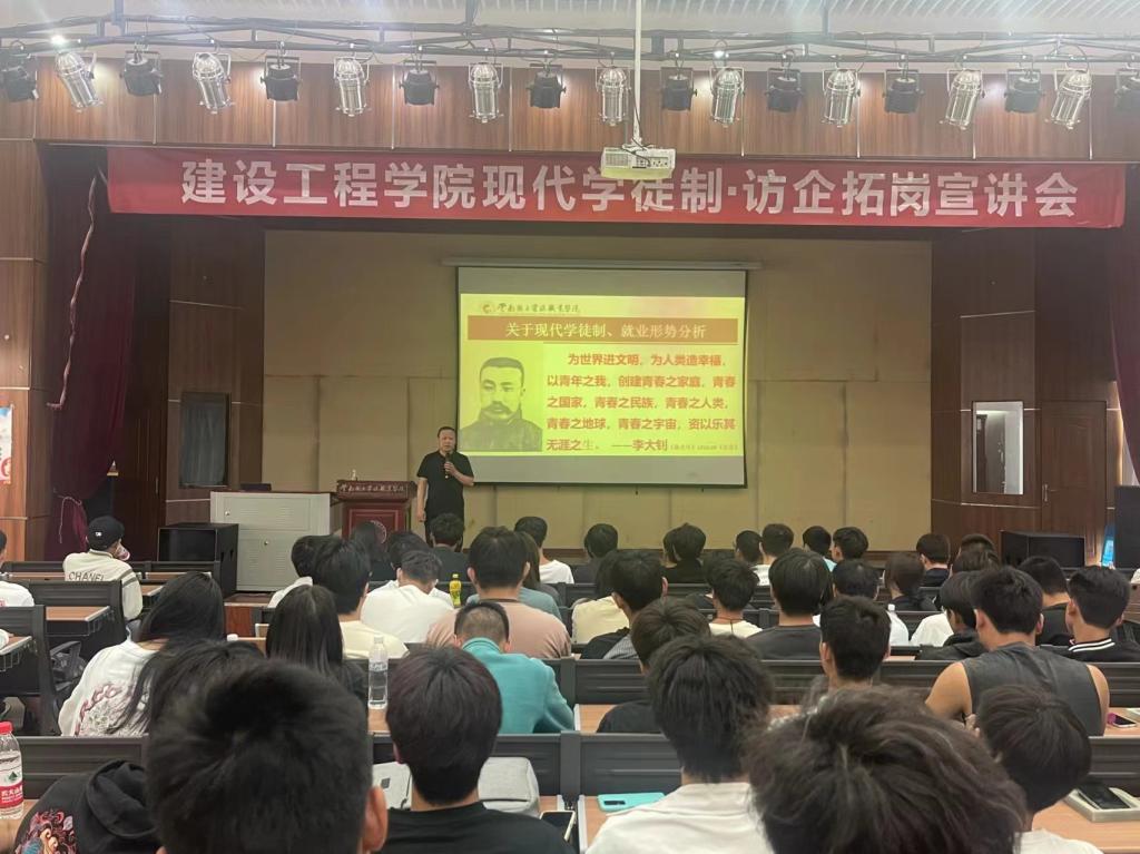 5月14日17:20,彭明兴经理在光荣讲堂为2022级建筑经济信息化管理、地下与隧道工程技术、建筑材料工程技术三个专业的同学们讲解什么是现代学徒制、为什么要开展现代学徒制,以及现代学徒制与岗位实习和就业的关系等内容。