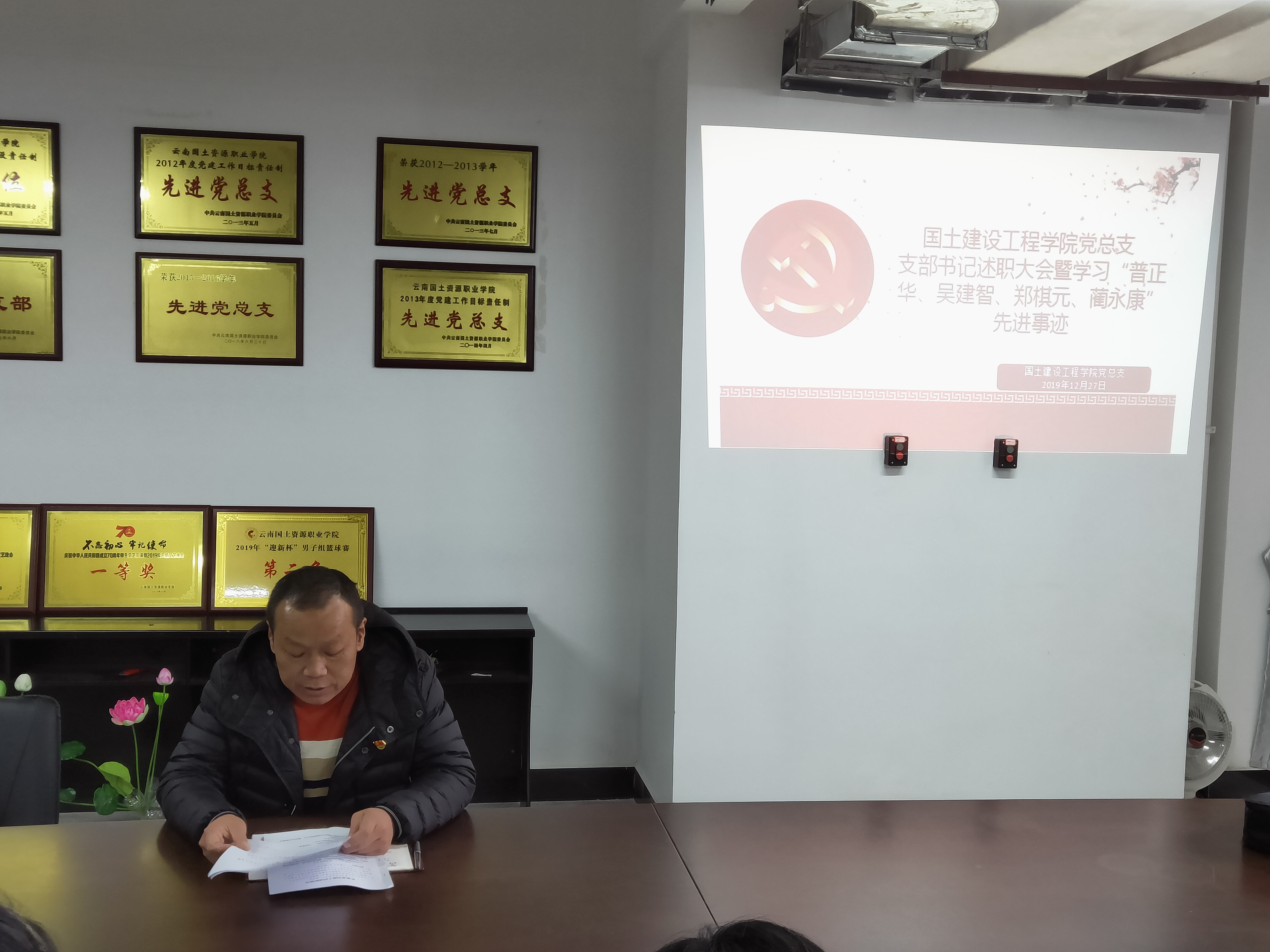 12月27日中午明尚楼c301,国土太阳成集团tyc122ccvip党总支组织召开支部书记述职会。建工公司全体党员和非党员教师共34人参会,会议由党总支书记高昆同志主持,工程管理党支部书记张宁同志、工程造价党支部书记廖术龙同志、后勤党支部书记王春莲同志分别就2019年抓支部党建工作情况进行述职。