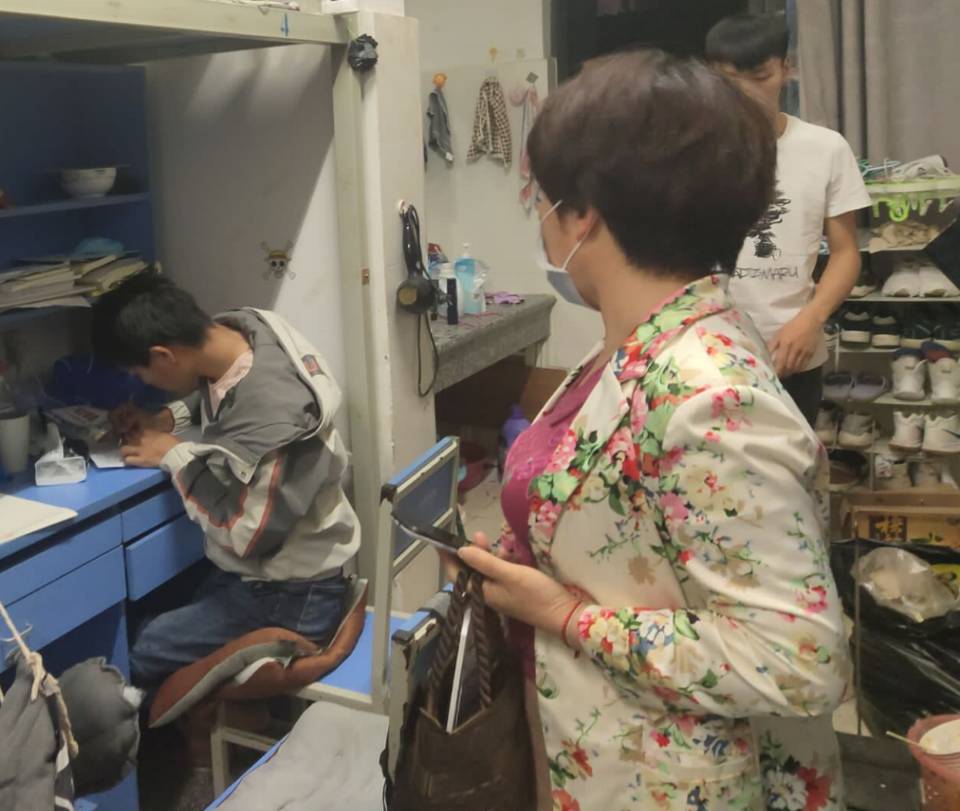 5月27日晚,国土太阳成集团tyc122ccvip党总支书记高昆老师、辅导员张宁老师与体温检测志愿者一同到员工宿舍为同学们测量体温。高老师来到19级每一间宿舍进行问候,与同学们悉心交谈,了解他们返校后的学习和生活状况,给予每位同学家人般的关怀。高老师还为同学们普及了防疫知识,告诫大家不随意聚集,不随意走动宿舍,并耐心解释周末不允许随意外出的原因,希望同学们理解并配合;叮嘱同学们要勤开窗、勤洗手、勤换口罩等。检测体温的志愿者们一丝不苟的为每位同学测量体温并认真记录。