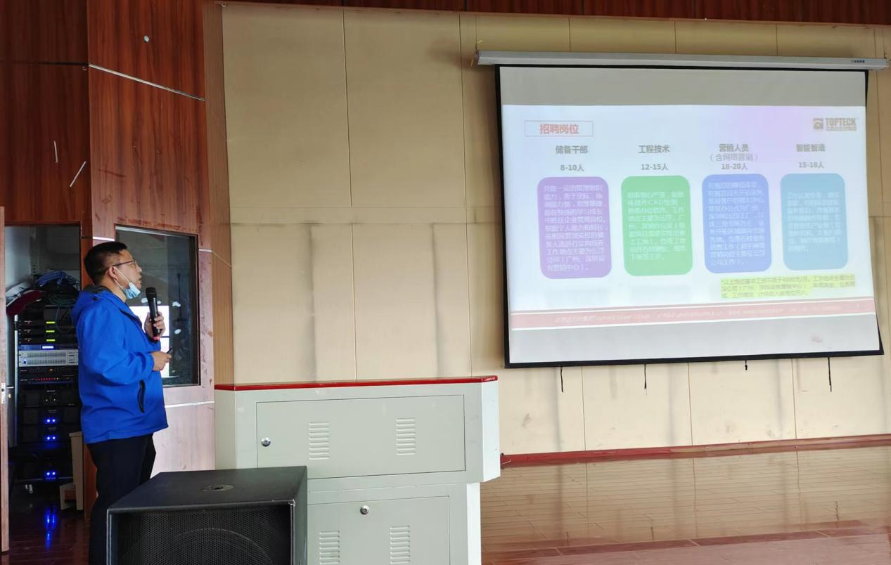最后,公司在广东龙美达石业有限公司实习的2019级实习员工代表宋国平给学弟学妹们分享自己的实习求职经历与感受,为学弟学妹加油打气。为了方便解答同学们在实习、求职方面的诸多疑虑,广东龙美达石业有限公司总经理方俊湘组织全场同学打开微信,通过面对面建群的方式组建了一个交流群,同学们可以在群里与用人单位直接沟通,提高了面试效率。