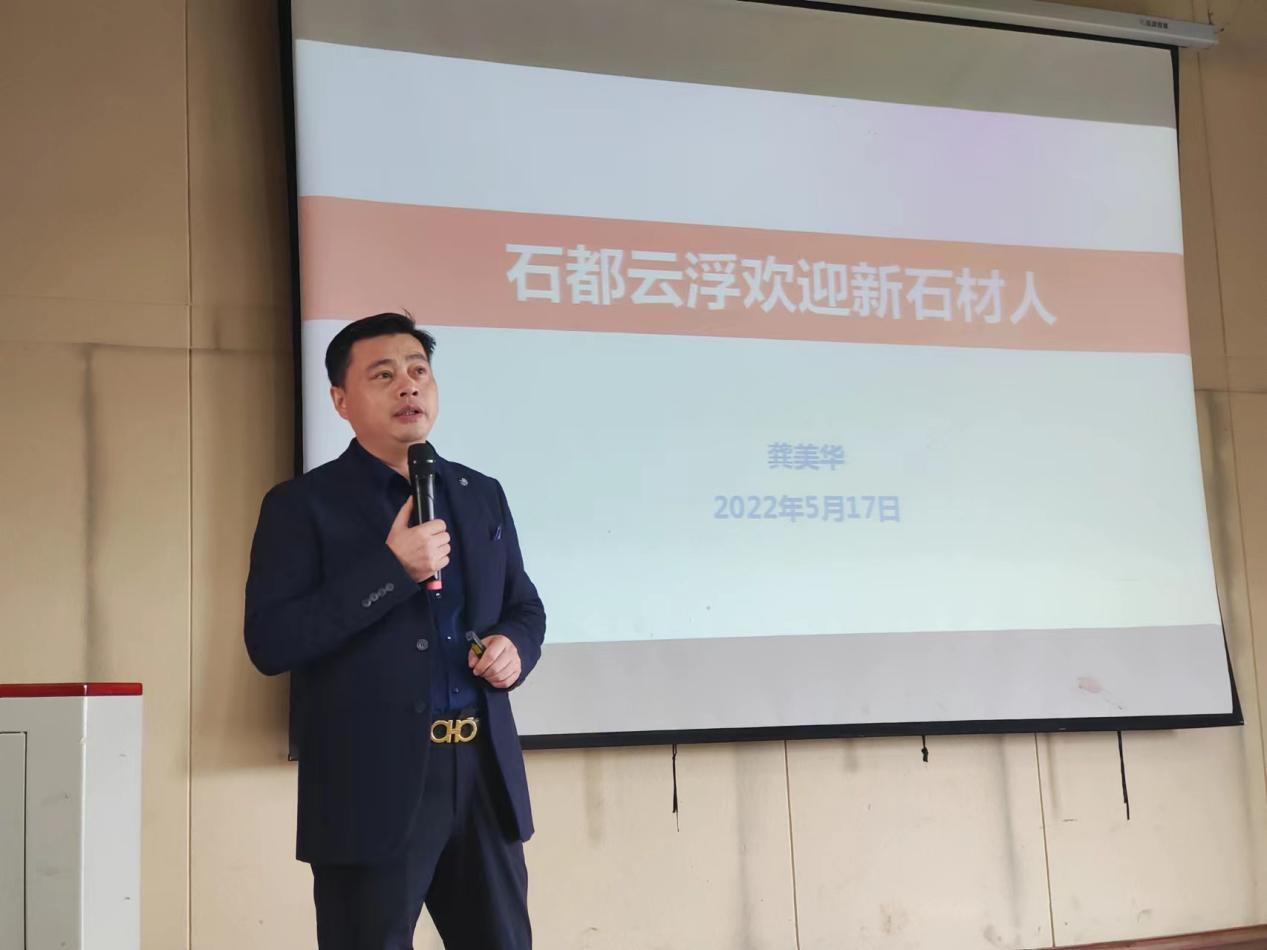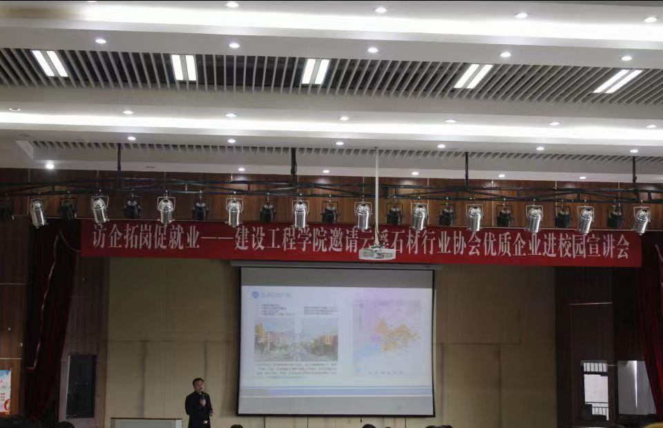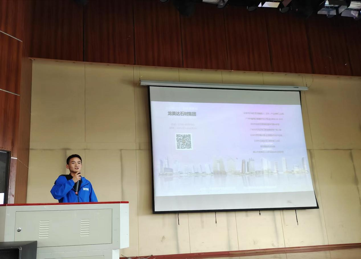 首先由云浮市石材行业协会常务副会长、广东龙美达石业有限公司董事长龚美华作了题为“石都云浮欢迎新石材人”的宣讲,他从云浮石材介绍、石材行业产业链、毕业生择业三要素、企业需要什么样的人才、社会路怎么走几个方面一一展开陈述,教同学们如何选择行业、选择企业、选择前进的方向。在此过程中,同学们了解到云浮石材加工已经有400多年的悠久历史,云浮全市共有石材企业6228家,涉及到的产业有矿山开采、工程项目应用、工程技术、智能制造、石材安装、晶面处理、石材养护等多个方面。