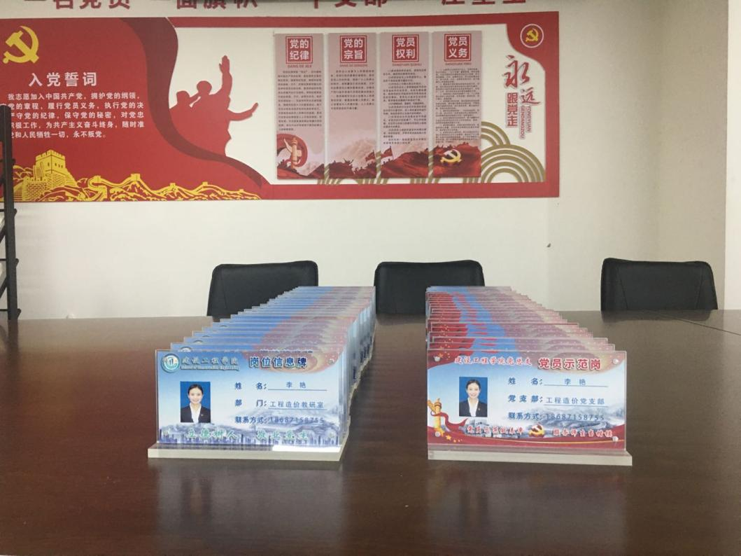 示范牌不仅仅标示出党员的身份,更体现了它是共产党员教职工们坚持共产主义、始终保持先进、为群众办实事的荣誉与载体。通过在各教职工办公桌醒目位置放置“党员示范岗”“岗位信息牌”身份牌的形式,亮出自己的身份,以此激发接受群众监督的自觉性和当先锋打头阵的荣誉感,不断强化责任意识和使命意识,充分发挥教职工的示范引领作用及其党员示范岗位的带动辐射作用。